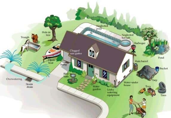 In this image you see places around your house where water can remain. These are the points for attention!